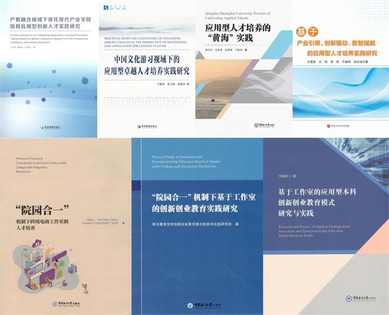 7部著作包括《“院园合一”机制下跨境电商工作室制人才培养》《“院园合一”机制下基于工作室的创新创业教育实践研究》《基于工作室的应用型本科创新创业教育模式研究与实践》《中国文化游习视域下的应用型卓越人才培养实践》《产教融合视域下依托现代产业学院培育应用型创新人才实践研究》《应用型人才培养的“黄海实践”》和《基于产业引领、创新驱动、数智赋能的应用型人才培养实践研究》。成果锚定应用型人才培养,深挖“四文化”融合育人特色,基于学院+产业园“院园合一”校企协同育人机制,建强师资团队,打造赋能平台,做优服务体系,凸显了“学生主体、学校母体、工作室载体”综合功效。著作体现了五年来学院凝心聚力、上下联动,为实现由机制统领到模式构建再到效能提升“三连跳”,在专创融合、产创融合、思创融合、科创融合“四创融合”方面所做的创新探索和实践成效。