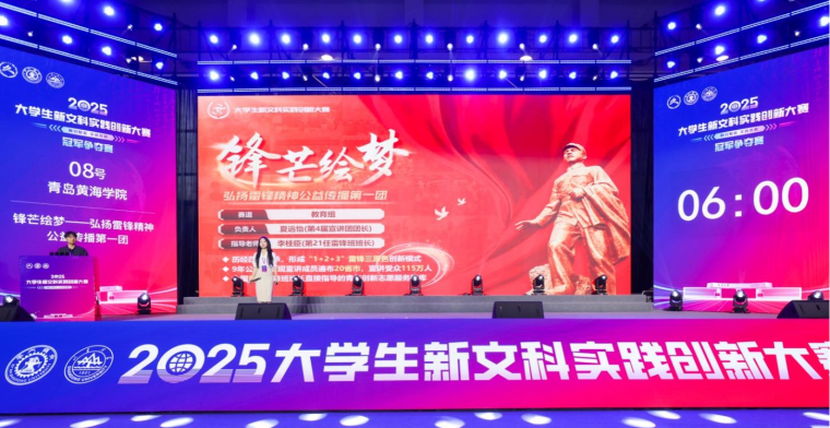 2025年11月28日-30日,2025年大学生新文科实践创新大赛决赛现场赛在西安交通大学举行。青岛黄海学院参赛项目《锋芒绘梦——弘扬雷锋精神公益传播第一团》凭借其深刻的时代内涵、创新的实践路径与卓越的现场表现,在众多顶尖项目中脱颖而出,一举斩获全国金奖,并成功入围大赛最高荣誉——冠军争夺赛,取得了历史性突破。