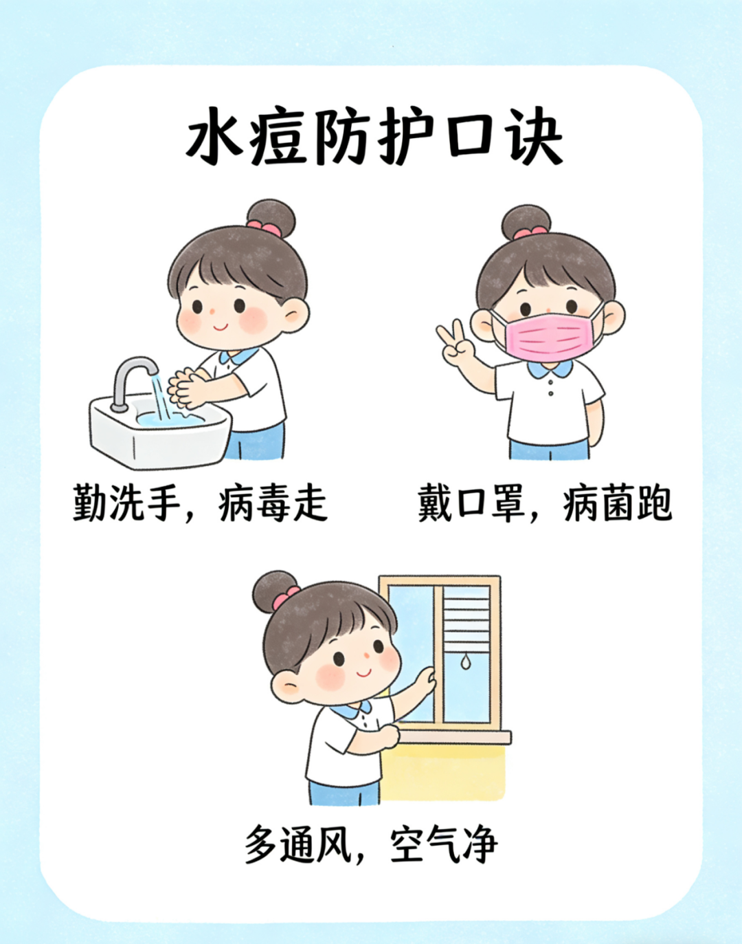 水痘可防可控不可怕,最怕的就是大家不重视、不防护!班级里做好防疫宣传,别让小小的水痘,打乱我们的学习和生活节奏。健康才是大学生活的底气,做好防护,才能安心奔赴课堂、图书馆和每一场热爱的活动呀~最后,快把本篇转给你的室友、同桌、好朋友,全员做好防护,远离水痘,健康度过校园时光!