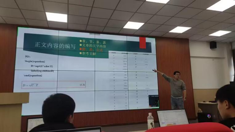 培训过程中,李博士先从理论入手,向参训学员介绍了Latex软件的环境配置、工作方式、文档的基本结构和基本概念,然后以学校本科毕业论文模板为基础,讲解、演示了数学公式编辑、表格制作、图片引用、文献管理与引用等操作的代码实现。参训学员在李博士引导下,相互讨论、相互学习、相互帮助,最终完成学习任务。