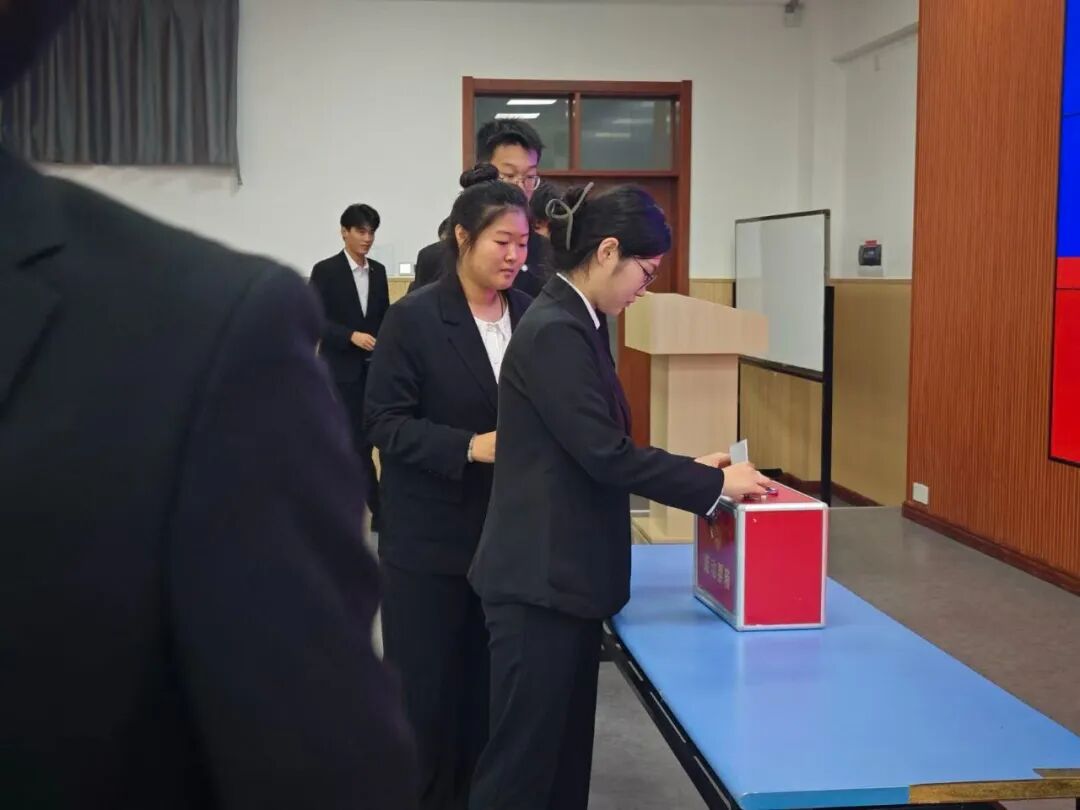 换届选举既是使命交接的核心,更是担当续力的关键。大会宣读新一届主席团候选人名单,详细介绍其基本情况、任职经历与工作表现。流程严格依照大会选举规则开展,总监票人、监票人、计票人全程监督,从票箱检查到选票分发,各环节操作严谨规范。经统计,选举有效,4名候选人获半数以上赞成票当选,全场掌声祝贺。学生会“服务同学”的使命成功交接,实现薪火永续。