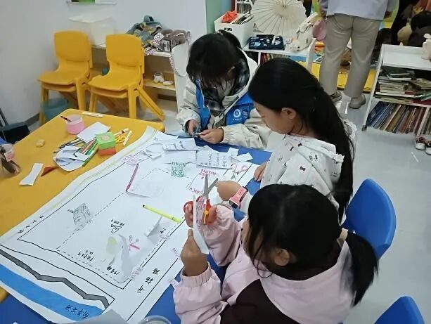 带着满满的“侦查成果”,小侦探们凯旋,回到我们的活动空间。这里,一幅巨大的空白社区底图正等待着被点亮。各小组将通力合作,将刚才记录下的超市、快递站、诊所、公交站、小公园等信息,整理、绘制到地图上,并使用不同的颜色为不同的区域进行划分。