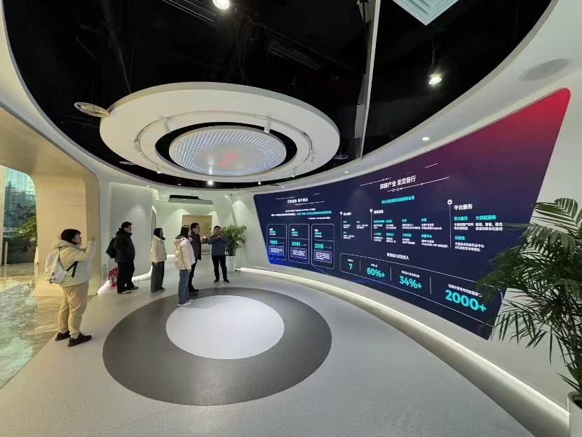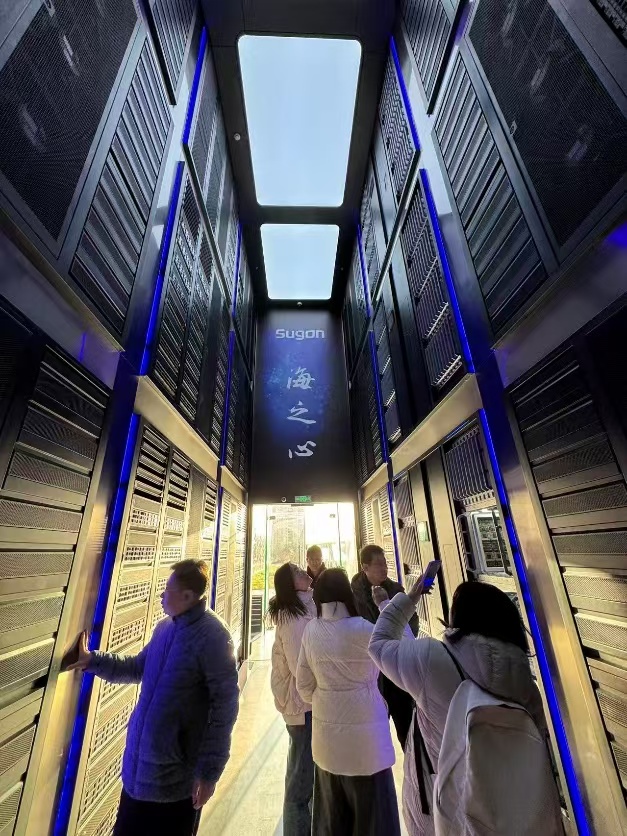 访问团一行在中科曙光“海之心”人工智能计算中心受到赵经理与卞经理的热情接待,并参观了先进的算力基础设施。赵经理详细介绍了公司自主研发的芯片与高性能计算服务器,重点展示了基于国产全精度通用架构的液冷技术与硅立方平台。此外,中科曙光还演示了其OneScience平台,该平台整合了多个人工智能驱动的科研模型,为生物信息、流体仿真等领域提供全流程技术支持。