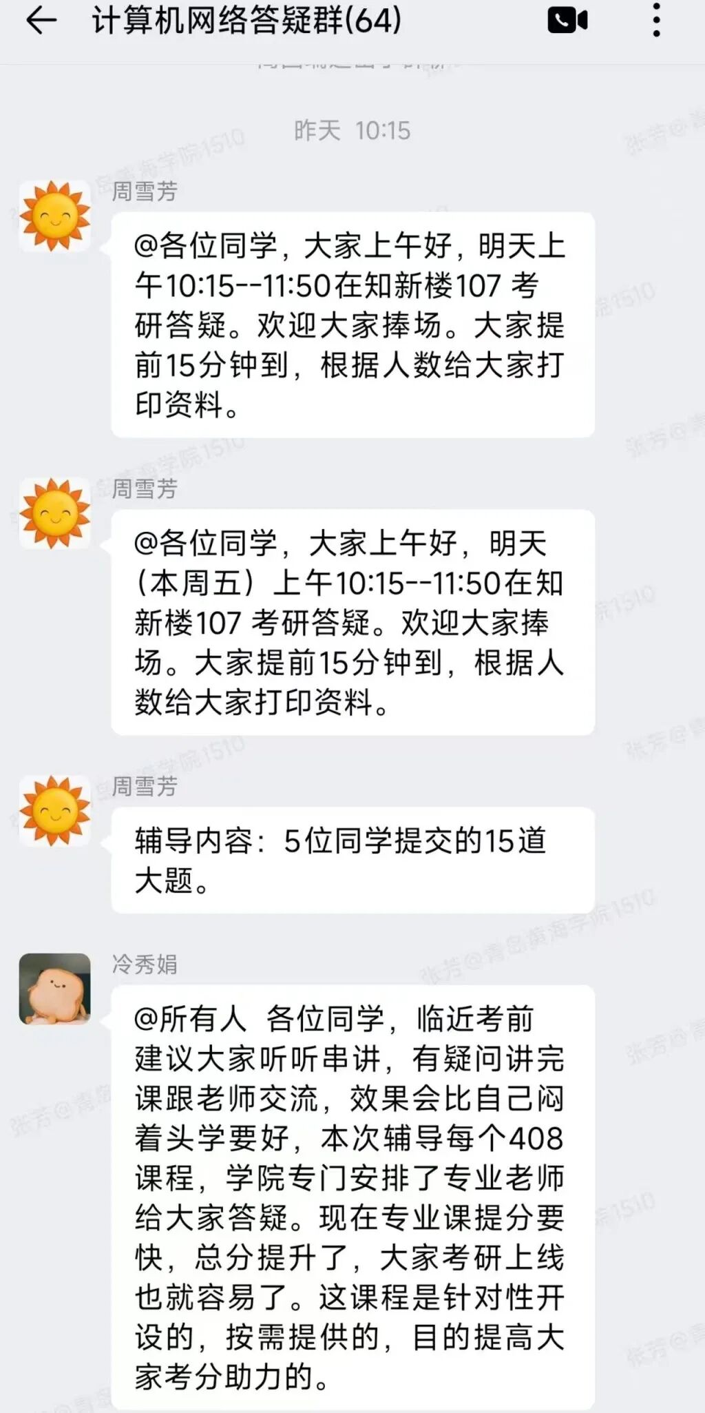 作为信息类专业考研的核心统考科目408一直是学子们复习路上的 “硬骨头”。为破解这一备考难点,冷秀娟院长从答疑体系搭建初期,明确 “靶向辅导、点对点突破” 的核心思路,打造 “408 专项答疑服务体系”,对 408 统考核心科目(操作系统、数据结构、计算机组成原理、计算机网络)的复习难点,学院特别组建专业教师答疑群,集结各学科骨干力量,为学子提供 “线上实时响应 + 线下定点面授” 的点对点帮扶。线上群内,教师们全天候解答代码调试、原理辨析、题型拆解等问题,及时化解复习卡点;线下设立固定答疑时段,师生面对面梳理知识盲区、搭建解题思路,针对高频错题展开专项辅导。从知识点答疑到解题技巧指导,从复习规划调整到考前心态疏导,408 专项答疑服务体系始终以学子需求为核心,而院长的全力以赴支持,更让这份帮扶充满底气与温度。正如院长在答疑推进会上所说:“408 统考是学子们考研路上的重要挑战,学院必须拿出最优资源、最强力量,为他们保驾护航。” 这份坚守与担当,也让学子们倍感温暖与信心。