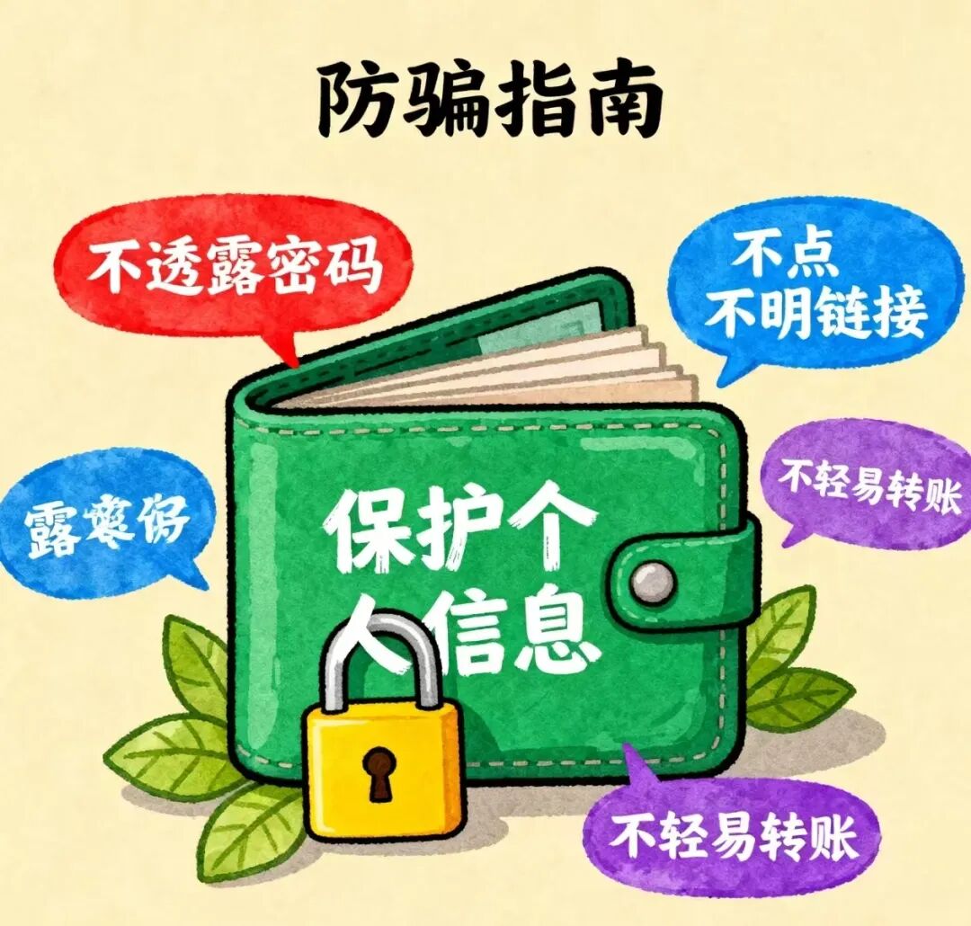 不向陌生人提供身份证、银行卡、验证码等信息。支付时确认收款方身份,避免扫描来源不明的二维码。