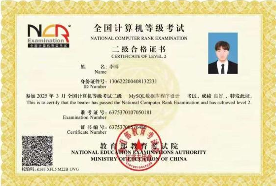 李博,男,汉族,共青团员,河北保定人,青岛黄海学院信息科学与工程学院2023级大数据技术专科3班学生,综合测试得分90.88,专业排名第一;现任心理委员,曾任2024级星光影视协会会长,荣获校级学生干部。获2025-2026年思学奖学金、2025-2026年国家奖学金、2024-2025年国家励志奖学金,全国大学生数学建模国家二等奖、全国大学生市场调查与分析大赛国家三等奖、亚太地区大学生数学建模国家三等奖、全国大学生电工数学建模国家三等奖、中国机器人及人工智能大赛山东省三等奖等奖项,累计获得国家级、省部级奖12项;考取网络与信息安全管理员高级证,MySQL数据库二级;发布1刊省级期刊论文,软件著作1项;参与2024年暑期社会实践,作为数据分析师协助跨境电商公司一年共盈利百万余元。