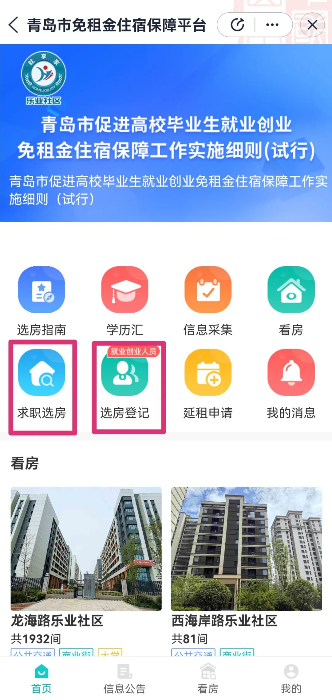 答:手机下载“爱山东”APP,搜索“青岛市免租金住宿保障平台”,完成个人相关信息采集和认证,求职人员点击“求职选房”、已实现就业创业人员点击“选房登记”,查看并签署个人承诺书,提交选房申请,线上选择免租金住宿保障住房所在社区,由平台自动分配房间。审核通过的,自收到租住通知起5日内到所选住房现场办理租住手续,无正当理由超期未办理手续视为自动放弃租住资格。