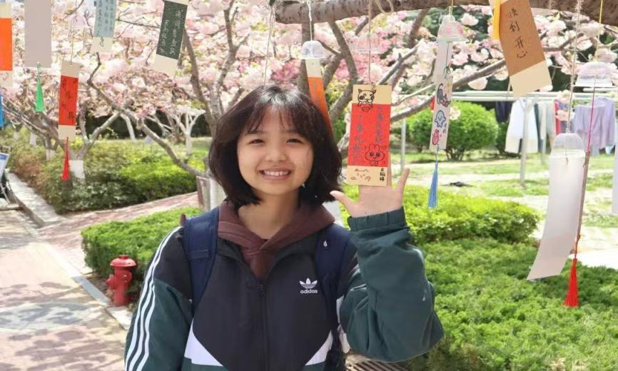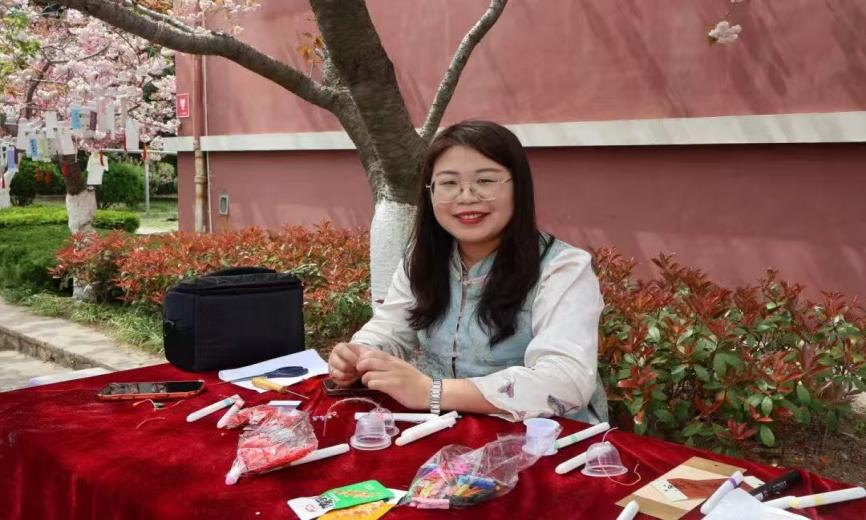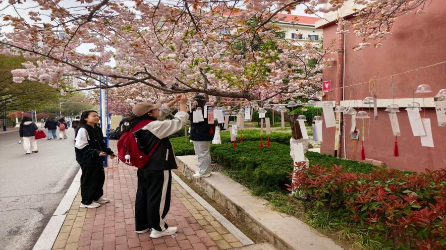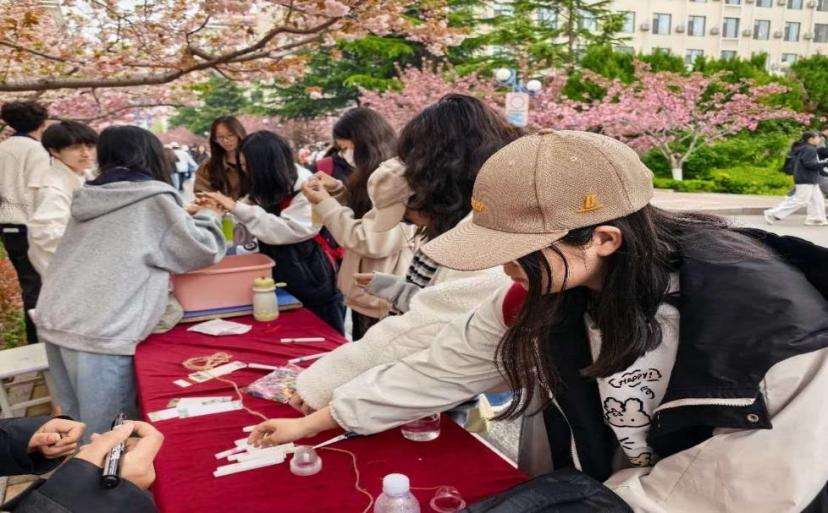 “风铃寄情·美育润心”在校园樱花大道举行,现场准备了果冻壳、书签卡片、毛线等手工素材,并安排志愿者引导参与。