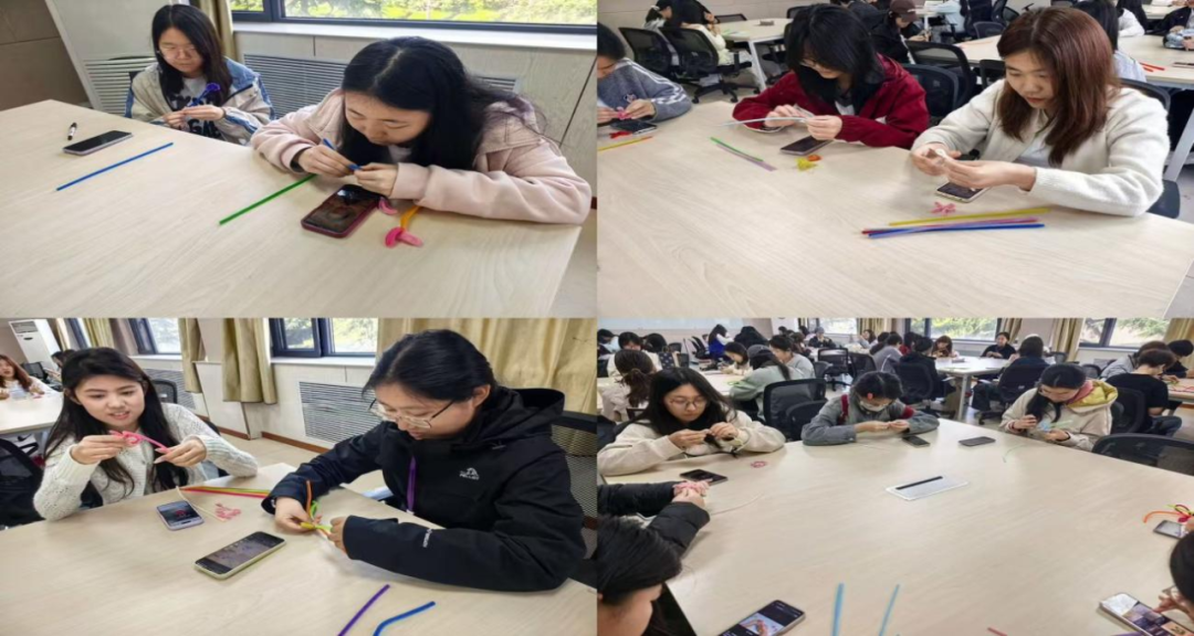 “扭出创意·艺享青春”在知新楼东配202和204举行,现场备有多色扭扭棒及辅助材料,志愿者在现场进行帮助,同时指导老师也来到现场,与同学一同完成创作。