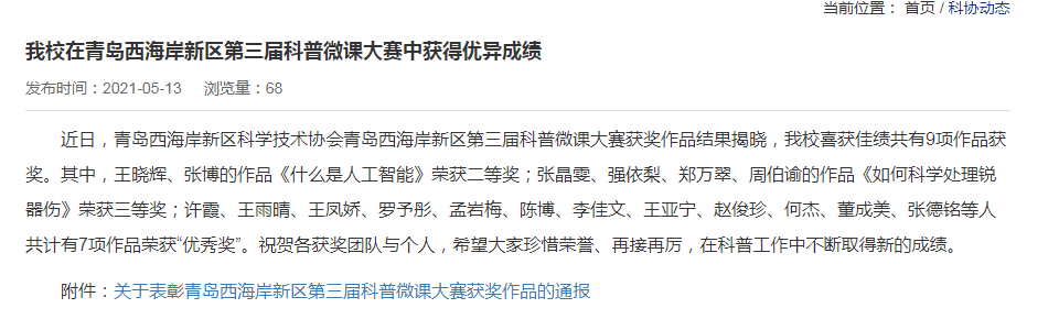 许霞老师在青岛西海岸新区第三届科普微课大赛中获得优异成绩