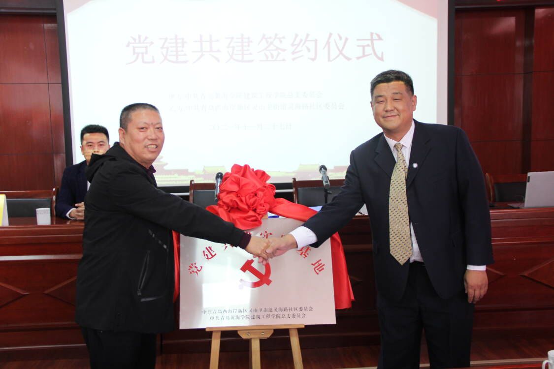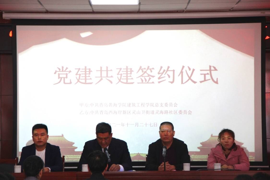 为全面贯彻党的十九大精神、加强新时代基层党支部建设、建立促进基层党建取得实效的协作平台,11月27日下午,青岛黄海学院建筑工程学院党总支携手青岛西海岸新区灵山卫街道灵海路社区党委共同打造“共创共建”党支部。本次签约仪式在窝洛子社区科普馆举行,建筑工程学院党总支书记赵国光、组织委员衣淑丽,建筑工程学院学生支部书记赵铭涛、组织委员赵刚,灵海路社区党委副书记管明志、组织委员王凤等同志出席签约仪式。