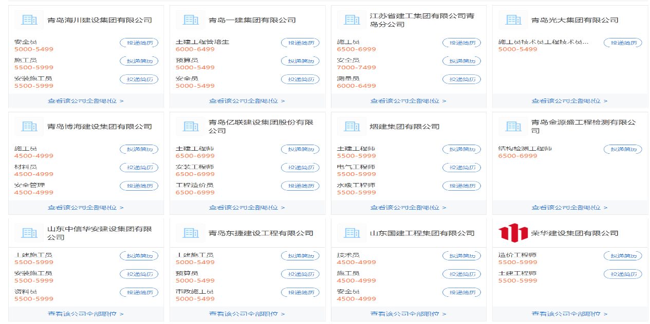 青岛黄海学院2021年下半年线上招聘活动开始了,17家参会企业,1686个可投递单位,为你提供高质量就业岗位。参会企业有:青岛海川建设集团有限公司、青岛一建集团有限公司、江苏省建工集团有限公司青岛分公司、青岛光大集团有限公司、青岛博海建设集团有限公司、青岛亿联建设集团股份有限公司、烟建集团有限公司、青岛金源盛工程检测有限公司、山东中信华安建设集团有限公司、青岛东捷建设工程有限公司、荣华建设集团有限公司、山东国建工程集团有限公司、宏盛谊联(北京)楼宇科技发展有限公司、山东宏桥新型材料有限公司、中精信工程技术有限公司、中国化学工程第十六建设有限公司、山东尚智建设有限公司等等。