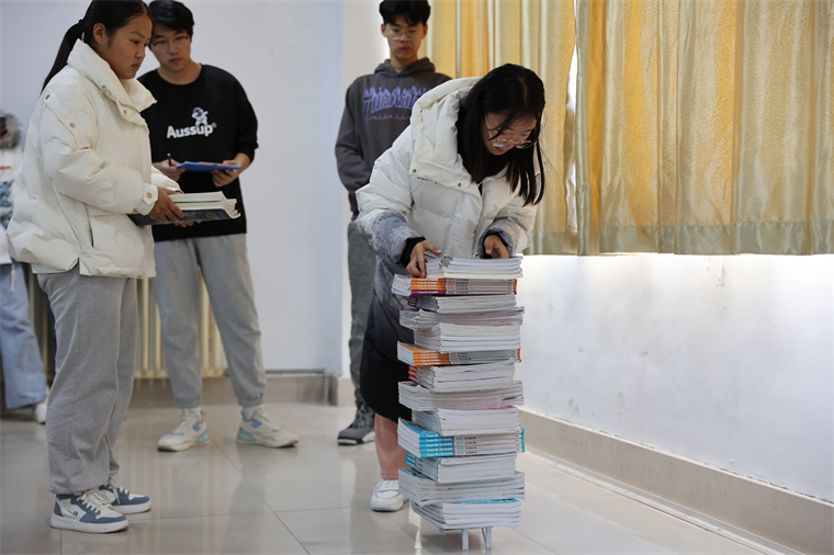 大赛按报名表顺序依次展示,一个同学小心翼翼的将重物压到纸桥上,旁边同组的同学还时不时帮助他增加重物。最后他们小组得到了一个比较满意的承重成绩。有许多选手虽没有根据老师提供的样板来设计和制作,但自己动手创新,也取得了不错的成绩。