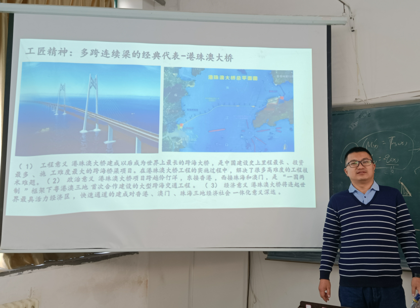 根据学院的安排,本学期所有课程都要开展“课程思政”建设,要挖掘思政元素,合理、有效的融于教学过程中去。《结构力学》课程自2020年7月立项为校级 “课程思政”示范课程建设项目以来,不断推进课程思政建设。下图为范晓鹏老师在讲到多跨连续梁时,结合港珠澳大桥项目,讲解工匠精神。