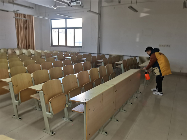 志愿者严格按照消毒要求,对教室、宿舍等日常公共区域进行了全面消毒、消杀、通风,努力把卫生防疫工作做细、做深、做实,全力杜绝病毒、细菌滋生,为保障师生的安全返校奠定坚实基础。