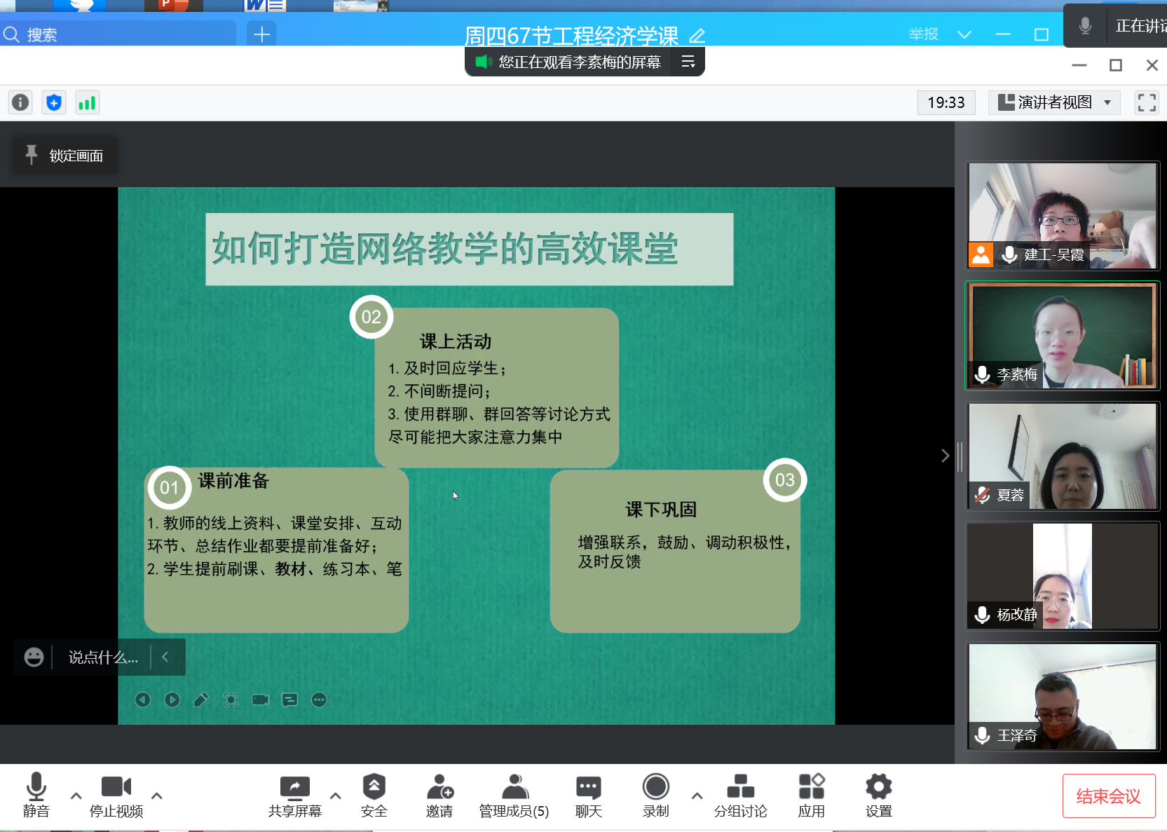系主任吴霞老师经历了两次线上教学,2020年疫情后就将所教授的《工程经济学》建成网络课程,2021年建设为在线开放课程,并在山东省课程联盟平台上线运行。在本次线上教学中进行了充分的实践应用,对已建线上课程,在教学的实施、课程资源的整理分类、教学过程的有效设计、教学环节的组织安排、经验总结反思等分享了宝贵经验,同时也为老师们积极申报在线开放课程、建设网络课程提供了好的案例。