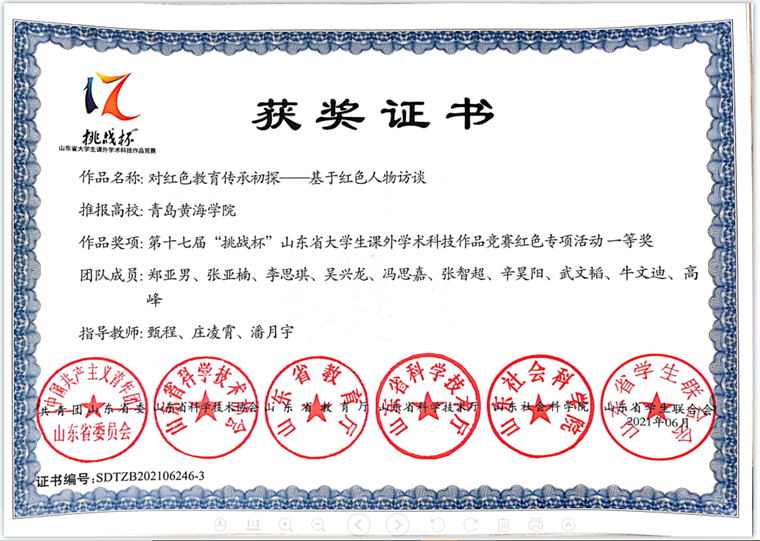 在2020-2021年度获得山东省挑战杯“红色专项”省级一等奖;