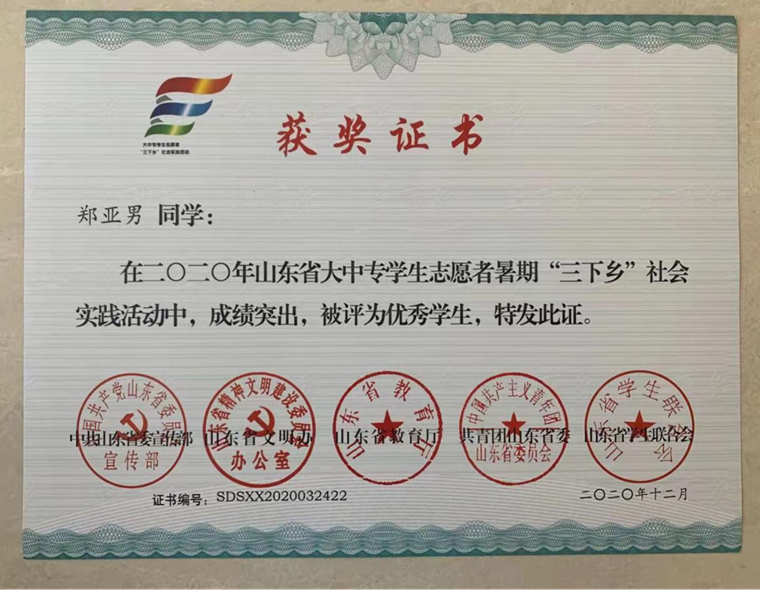 在2020-2021年度获得山东省三下乡优秀学生荣誉称号;