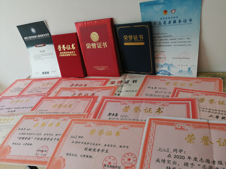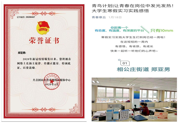 在2021年度获得“青鸟计划”获得章丘区优秀实习生荣誉称号;