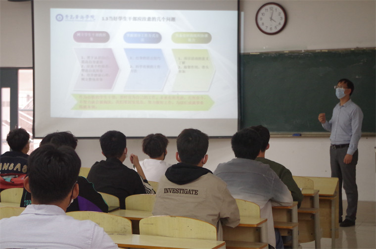 本次青马培训旨在明确团学干部的工作职责,介绍学生组织内的相关职责,强调了团学干部的工作能力,态度等。赵刚首先向团学干部们介绍了学生组织的工作,说明了学生组织的职责与考核制度,随后,对团学干部在学生组织中遇到的各种常见问题和误区进行全面分析与指导,对本学期实行的新政策进行解读。为方便团学干部记录学生组织活动,对学生组织活动进行了简单介绍,帮助团学干部健全完善相关制度,同时鼓励团学干部们积极参加校内组织的各项活动,对同学们寄予殷切希望。