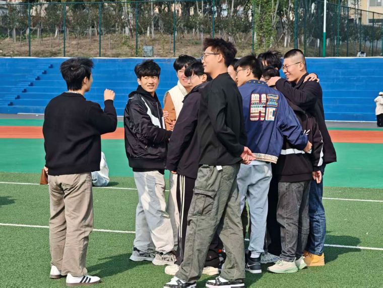 在“抱团打天下”游戏中,大家手拉手互动,只要一人节奏出错,整个队伍就要重新开始。同学们在一次次尝试中明白:“集体的成功,从来不是一个人的全力以赴,而是所有人的并肩同行”。