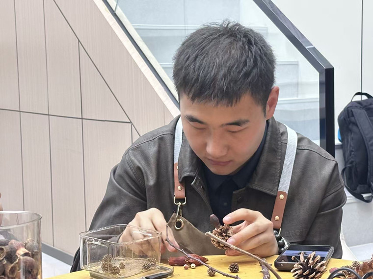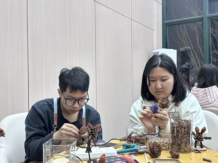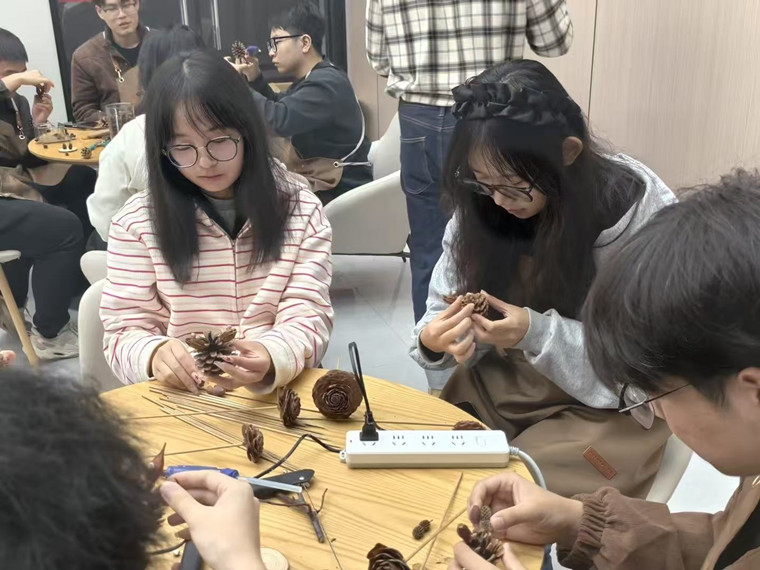现场氛围热闹而静谧,同学们沉浸式投入到手工创作中。大家手持热熔胶枪,小心翼翼地拼接每一颗松果;用橡果、枯枝巧妙缠绕,制作出造型别致的挂件;将各类果实精心搭配,拼接成独具创意的植物标本,每一个动作都饱含专注,每一件作品都凝聚巧思。“粘松果的时候要全神贯注,在自然造物里触摸温度,这份专注和耐心,让我对生活和学习都多了一份坚持。”一位参与活动的同学笑着分享自己的创作感悟。