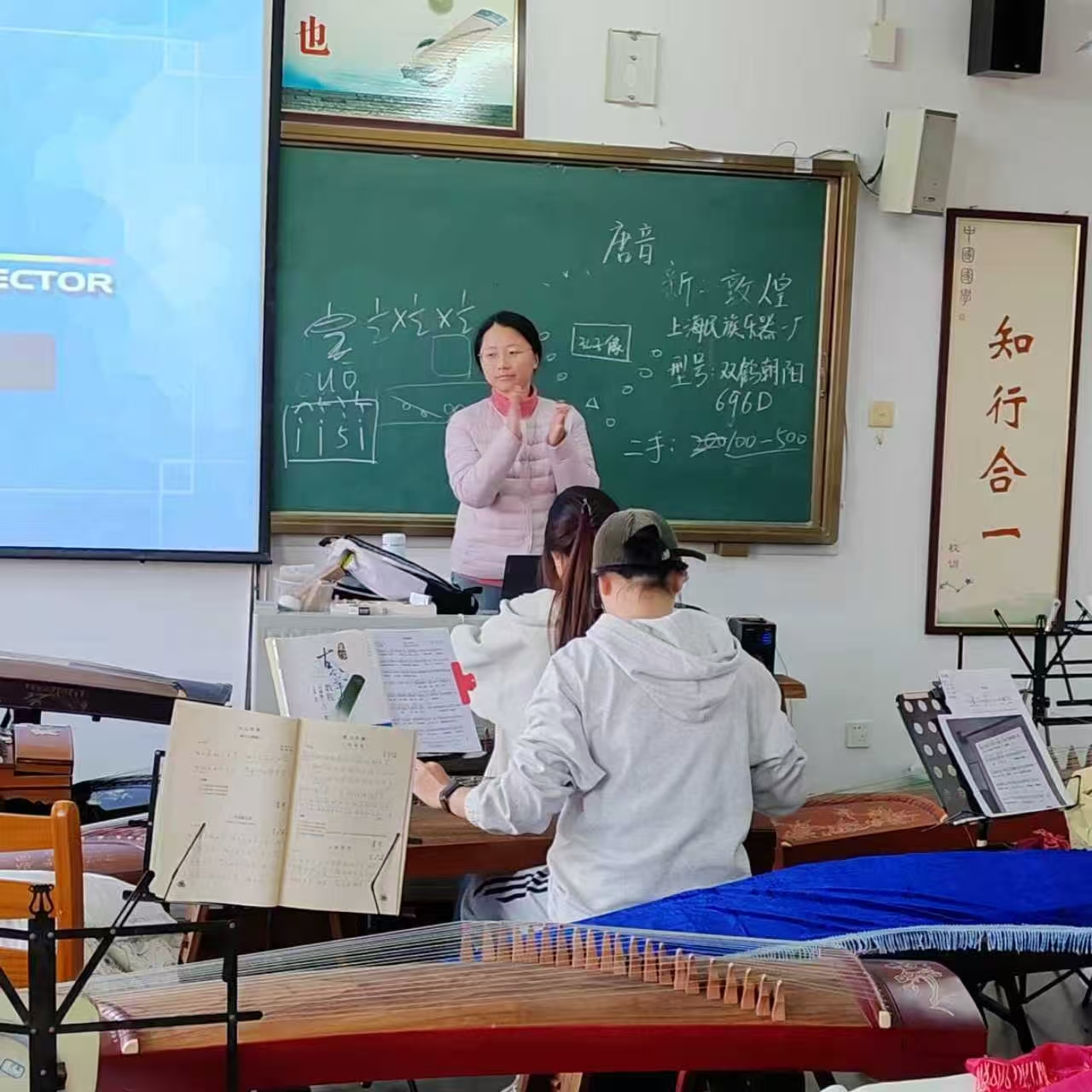 在张咪老师的《古筝》教室内,张老师从坐姿、指法讲起,将乐理知识与文化典故相融合,并指导学生进行小组练习。当古朴的琴音在教室中回荡,与会教师无不凝神静听,深刻体会到“移风易俗,莫善于乐”的教化力量。