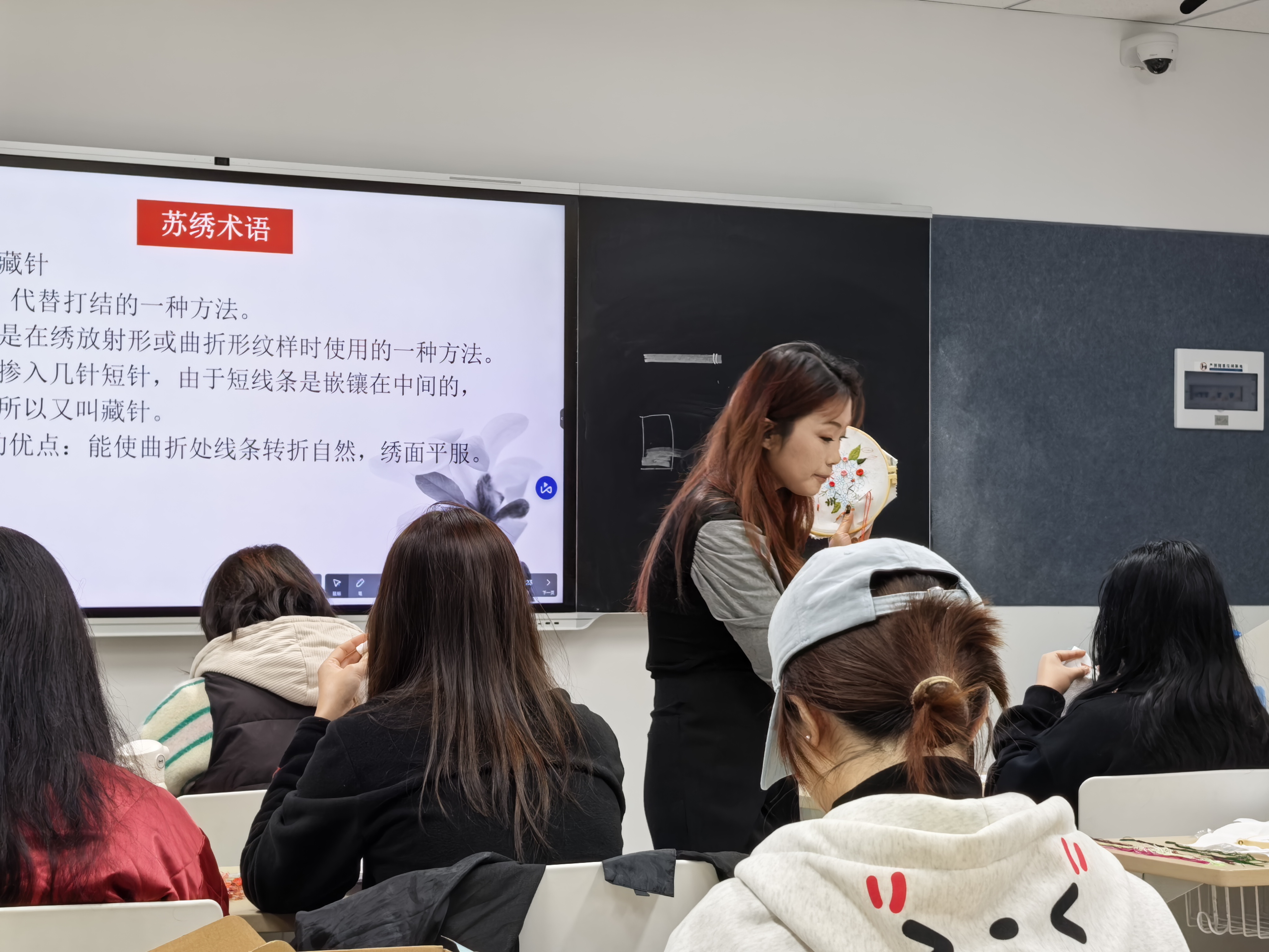薛泽丰老师的《刺绣》课堂则是一片静谧而专注的景象。薛老师展示了苏绣的精湛技艺,并耐心指导学生如何劈线、运针,学生们在一绷一绣间,不仅学习了手艺,更磨练了心性,感悟到中国传统女红文化中蕴含的匠心精神。