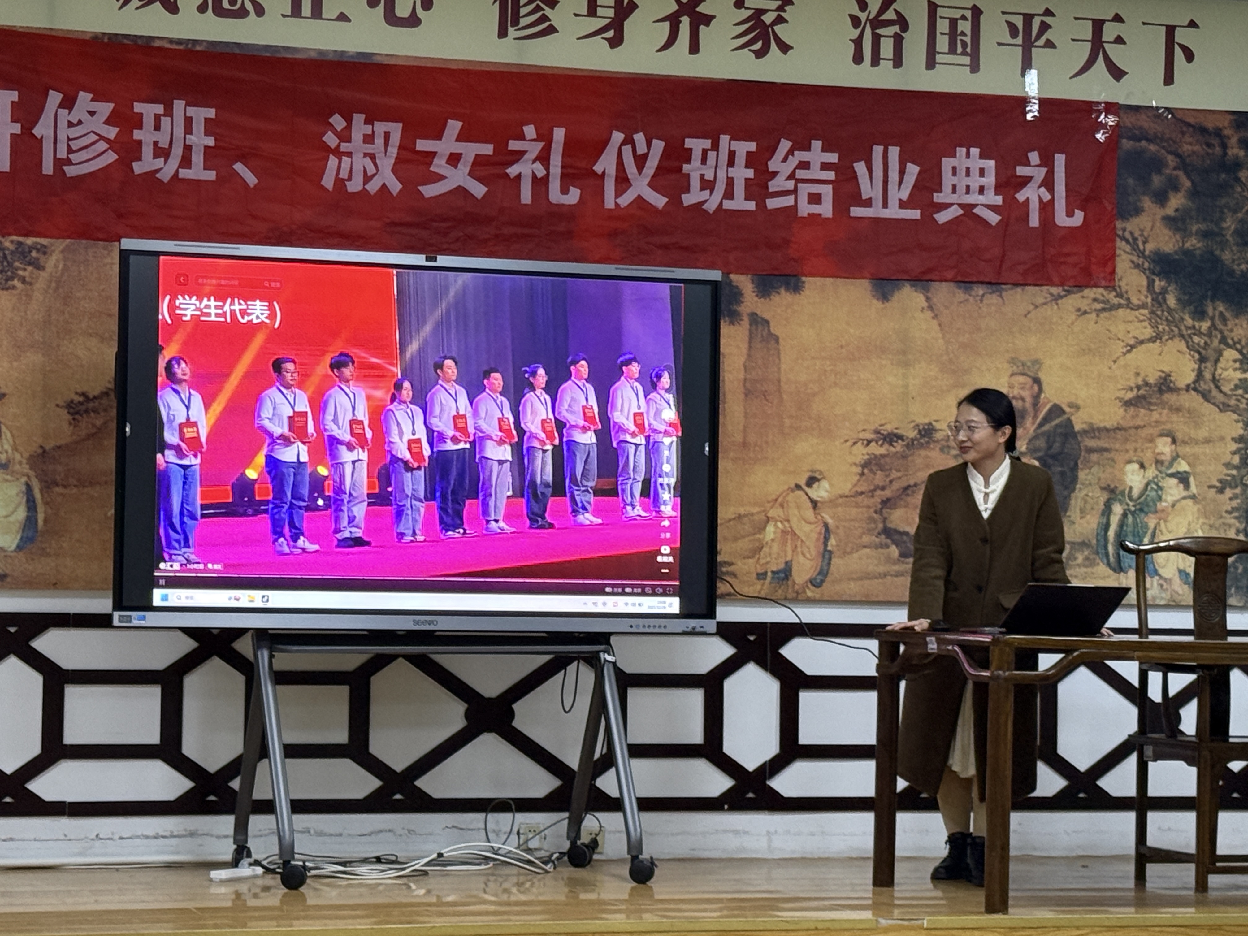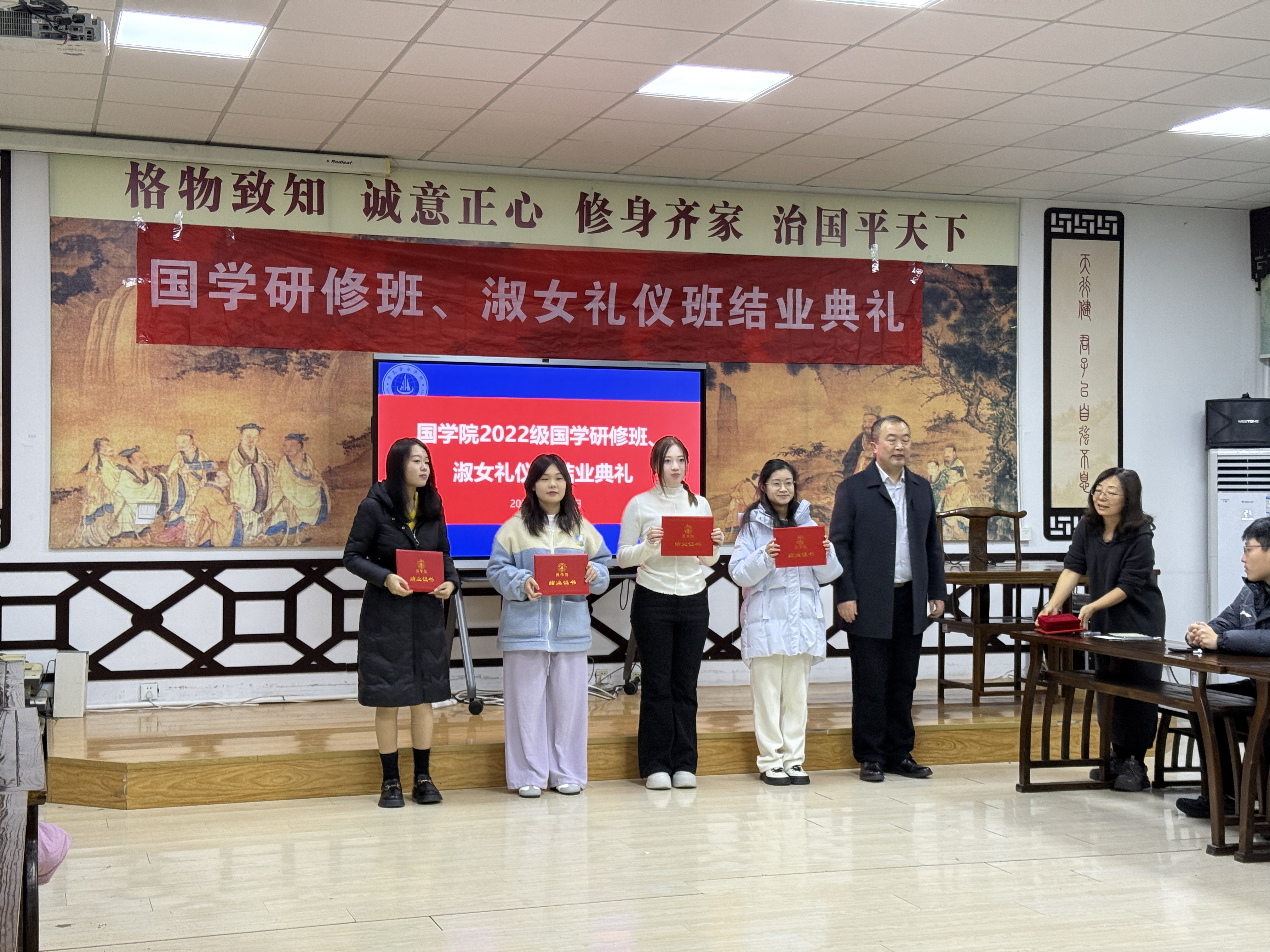 2025年12月26日晚7点,青岛黄海学院国学院在知诚楼孔子学堂隆重举行2022级国学研修班、淑女礼仪班学生结业典礼。语言文化学院(国学院)副院长张维霖及部分教师代表出席了典礼。典礼由传统文化教研室主任李昕昕主持,2022级结业学生代表、部分24级和25级学生共同见证了这一庄重而温馨的时刻。