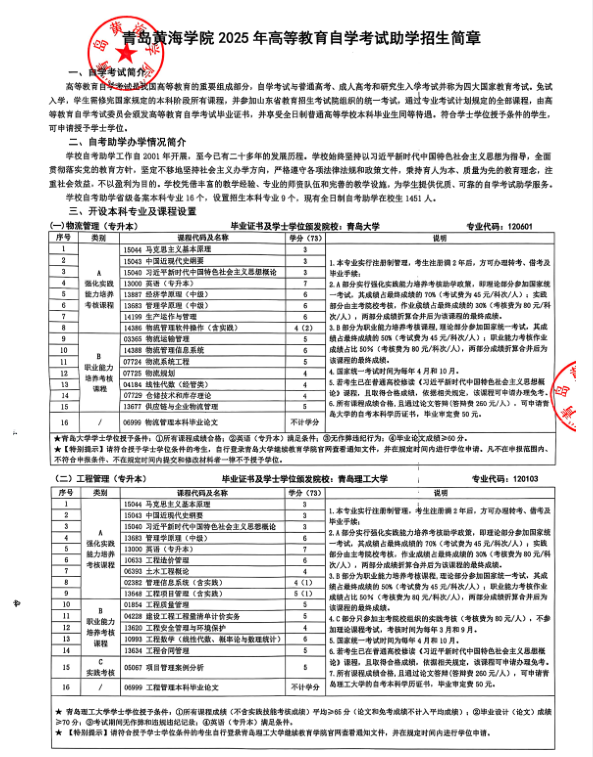 青岛黄海学院2025年度高等教育自学考试助学招生简章