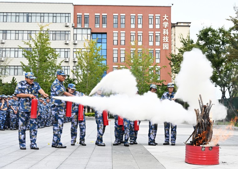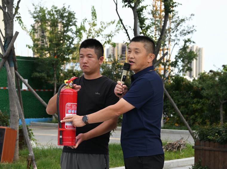疏散演练结束后,教官与学友导师带领新生开展灭火演练。安全管理处工作人员现场讲解疏散逃生安全注意事项,演示干粉灭火器“提、拔、握、压”操作方法,并组织新生代表实操扑灭真火;同时消防战士展示了消防车随车设备,让新生“零距离”感受消防。