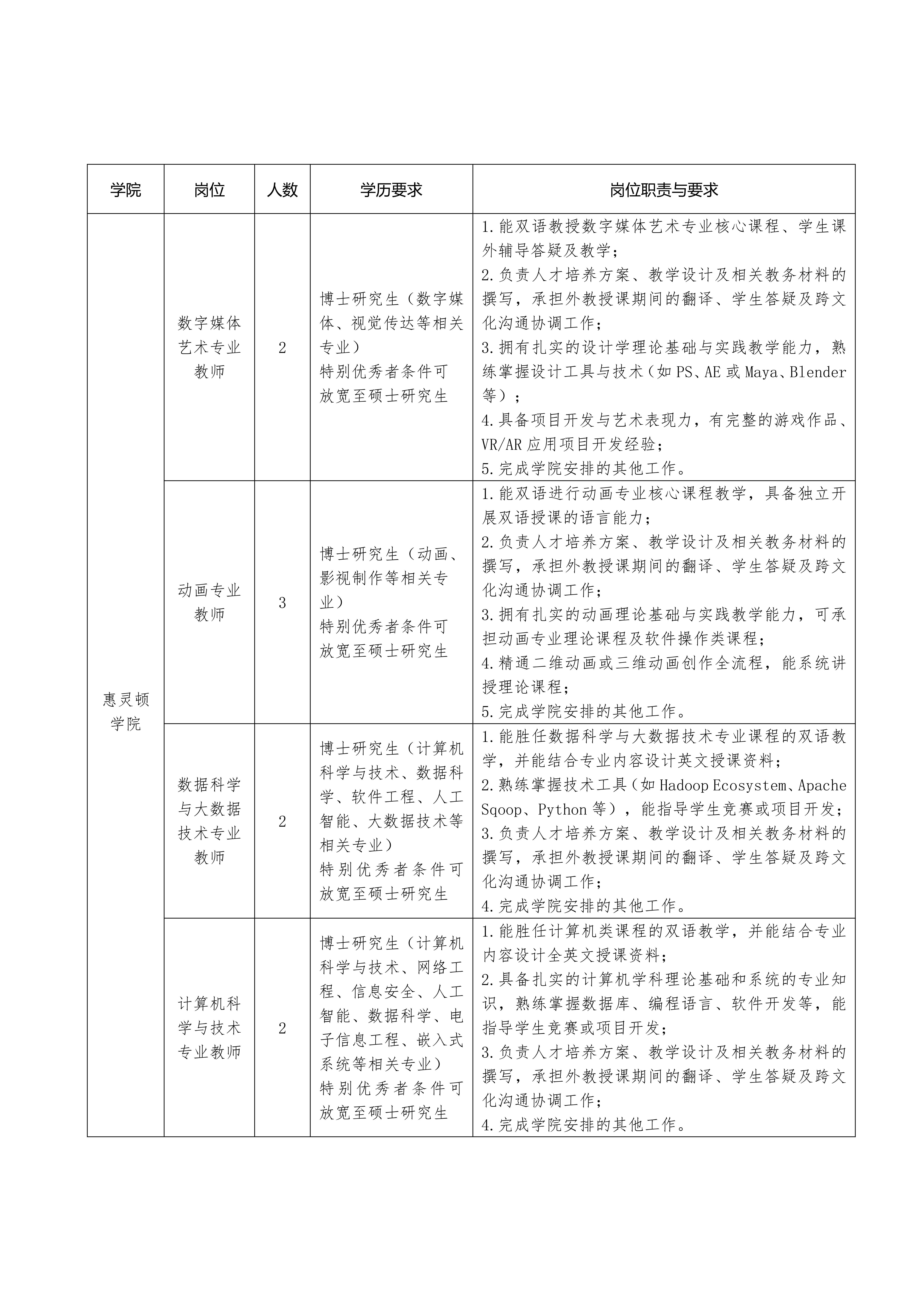 (二)专业教师需具有海内外博士研究生学历、学位,本硕博阶段所学专业与岗位需求专业相同或相近,海外留学人员须有经教育部留学服务中心出具的学历学位认证书;具备良好的英语语言表达能力,通过雅思6.5分以上或持有其他相应英语能力的证明;