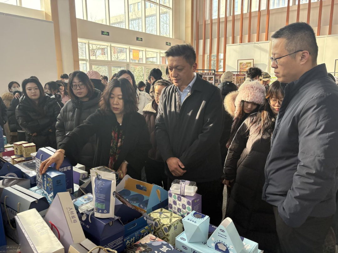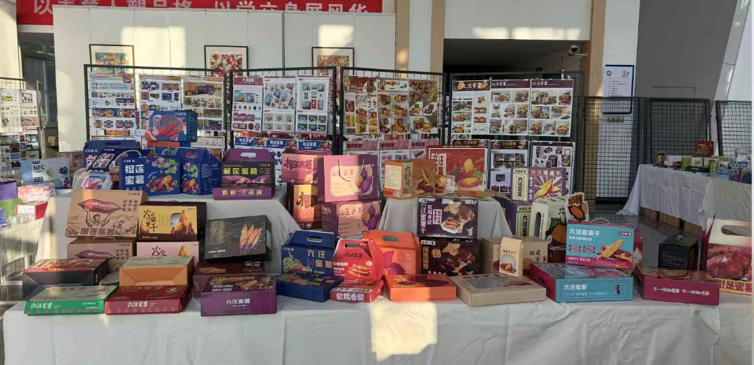 展览现场,塔桥全羊、胶河大白菜、六汪蜜薯等特色农副产品包装设计作品整齐陈列,凝聚着黄海学院师生对六汪风物与地域文化的理解诠释。师生们将专业美学与地方特色有机融合,创作出一批兼具功能性、美观性与文化内涵的包装作品,为六汪镇特色农产品品牌注入了青春活力与创新智慧。