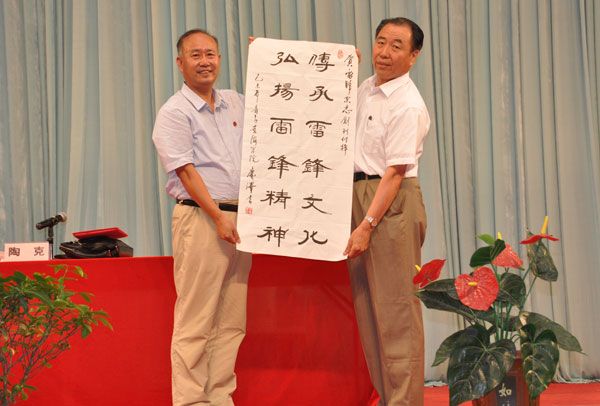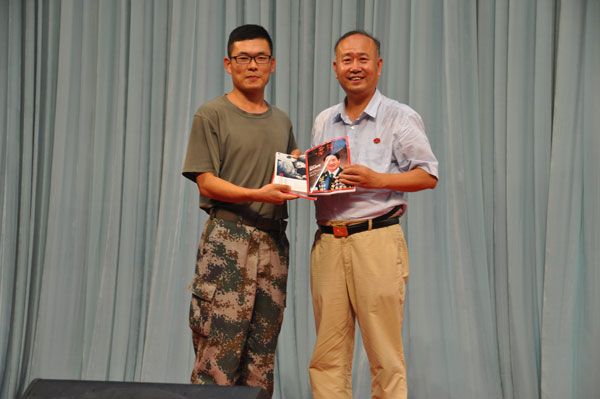 报告会后,校党委副书记宋庆泽代表学校诚聘陶克将军为我校思想政治教育客座教授,并为陶克将军颁发聘书。随后,陶克将军将历时15载创作的长篇纪实文学《告诉你一个真实的雷锋》赠送承训官兵,期盼大家都来读一读,争做新时代的雷锋。校党委副书记宋庆泽代表学校回赠亲自书写的“传承雷锋文化,弘扬雷锋精神”书法作品一幅,以表谢意!并以此祝贺《雷锋》杂志创刊发行。
