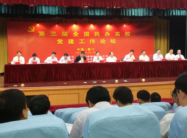 10月15日—16日,由教育部思想政治工作司指导,全国民办高校党建研究分会主办,厦门南洋职业学院承办的第三届全国民办高校党建工作论坛在厦门召开。来自全国30个省市、150多所民办高校的200多名学校党务工作者和专家学者,围绕“坚持立德树人思想引领、加强改进民办高校党建工作”的主题进行了学习、交流和研讨。教育部思想政治工作司副司长王光彦、全国教科文卫体工会全国委员会副主席陈晖、中组部组织二局副处长姜恩桥等领导参会。我校党委副书记宋庆泽应邀代表学校参会,介绍了学校“以雷锋精神培育和践行社会主义核心价值观”党建工作经验做法。