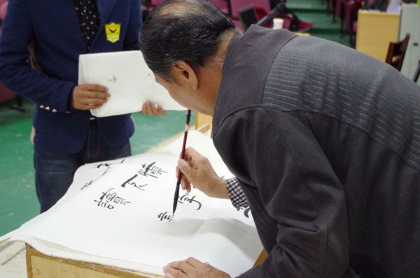 宋庆泽书记首先介绍了董事长以及学校对我校书画文化建设的大力支持。他向同学们展示了学校系列书画品牌活动的照片并结合自己50多年来学习书法的经验和心得,围绕“初学者如何学习书法”、“如何写好书法”等知识,给同学们进行了深刻的讲解。为了让同学们对书法有更深刻的认识,宋书记现场泼墨挥毫,书写了“发愤识遍天下字,立志读尽人间书”以表达自己对书画爱好者们的鼓励和期望。