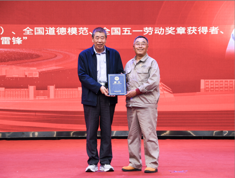 在全场师生热烈的掌声中,李清山为郭明义颁发“新时代雷锋精神育人”客座教授聘书。