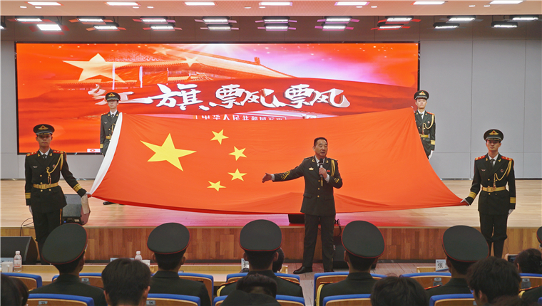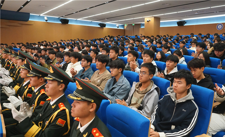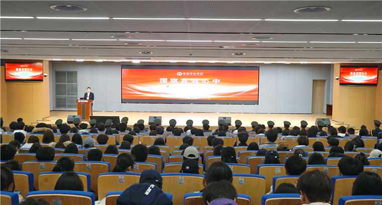 随后,通过一段段珍贵的影像资料,董立敢生动讲述了国旗的诞生历程、象征意义及护卫国旗的感人故事。从国旗尺寸的规范到升旗仪式的严谨,从风雨无阻的日常训练到天安门广场的升旗瞬间,董立敢用朴实的语言将“国旗精神”娓娓道来。他强调,“爱国旗胜过爱自己”,这份信念深深烙印在他心中,也激励着每一位在场的人。在场学生凝神倾听,深受触动,多次以掌声表达对国旗守护者的敬意。