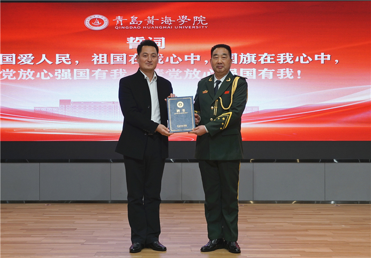 报告会现场,激荡着澎湃的爱国之情。董立敢以《国旗在我心中》为题作主题报告。报告开始前,董立敢受聘为青岛黄海学院“国旗护卫队”指导顾问。雷锋班第二十一任班长、青岛黄海学院武装部部长李桂臣为天安门国旗护卫队首任班长董立敢颁发聘书。