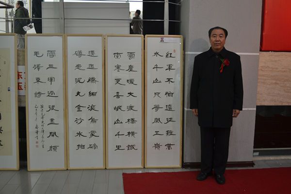 1月6日,共和国将军与书画名家联展开幕仪式在黄岛区名家美术馆隆重举行。原济南军区装备部副部长胡仁海将军,中国美术家协会会员会员、山东省美术家协会理事、青岛市美术家协会副主席邱振亮,黄岛区委宣传部副部长、区文联主席杜锡刚、国家一级美术师、中国青年美术家协会副主席王福林,山东科技大学艺术学院院长刘元法等领导嘉宾出席开幕式。我校党委副书记宋庆泽隶书四条屏参展并应邀出席开幕式。