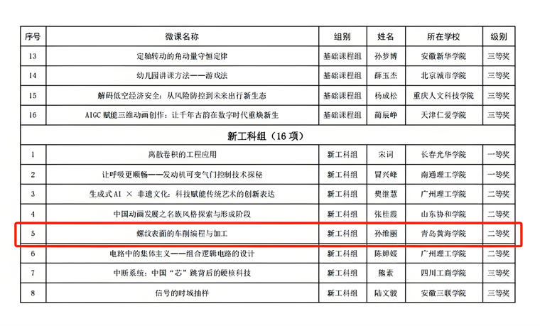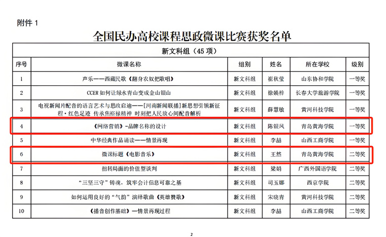 近日,由全国民办高校课程思政联盟、中国民办教育协会高等教育专业委员会联合举办的全国民办高校课程思政微课教学比赛结果揭晓,青岛黄海学院教师凭借扎实的教学功底与创新的课程思政设计,斩获新文科组一等奖、二等奖各一项,新工科组二等奖一项,彰显学校课程思政建设的丰硕成果。