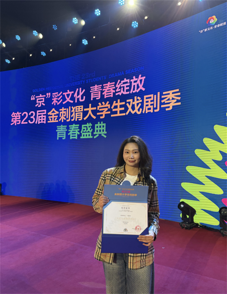 本届金刺猬戏剧季由北京市文化和旅游局、北京市文学艺术界联合会、共青团北京市委员会及北京市朝阳区人民政府联合主办。活动颁奖典礼于11月22日在北京郎园Station准点剧场举行,北京市文化和旅游局一级巡视员马文、北京戏剧家协会副主席王宝社、朝阳区委常委、宣传部部长冯志明等领导出席,国家一级演员、中国戏剧梅花奖及上海白玉兰奖获得者许娣亲临现场并为获奖团队颁奖。我校教师孟琪作为代表受邀参加典礼,与全国戏剧界专家学者共同见证了这一青春戏剧盛宴的圆满收官。
