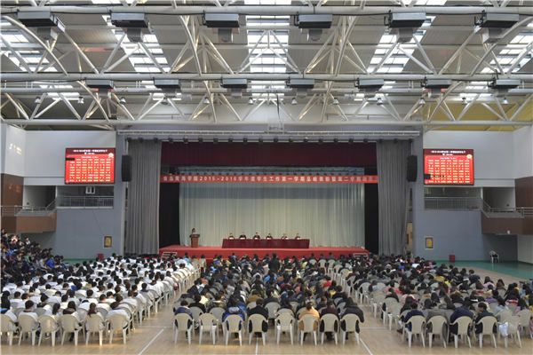 3月11日下午,青岛黄海学院2015—2016学年度学生工作第一学期总结表彰暨第二学期动员大会在校体育馆隆重举行。常务副校长李武修,省委高校工委党建联络员、督导专员王众臣,校党委副书记宋庆泽,校长助理张洪涛、郭启连等校领导出席大会。大会由校党委副书记宋庆泽主持。