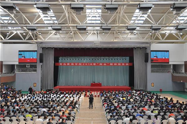 3月25日下午,全国劳动模范、十二届全国人大常委、全国总工会副主席、青岛黄海学院客座教授许振超来我校作2016年全国“两会”精神报告会。董事长刘常青,常务副校长李武修,校党委副书记宋庆泽,校长助理、综合办公室主任马永来,校长助理郭启连、张洪涛等校领导,教职工及学生代表4000余人聆听了报告会。报告会由校党委副书记宋庆泽主持。