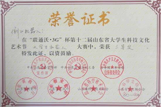 本次大赛作为山东省第十二届大学生科技文化艺术节的系列活动之一,由山东省委宣传部、山东省委高校工委、共青团山东省委、山东省教育厅、山东省文化厅、山东省科学技术协会、山东省学生联合会主办,山东省机器人研究会、共青团山东科技大学委员会承办。工程技术学院领导高度重视该项大赛,成立了以院长为组长的大赛领导小组,克服困难,创造条件,为参加大赛的学生提供帮助。获奖后,参赛同学发表获奖感言: “虽然我们获得奖项,但我们与一些参赛队相比还是存在一大差距的,我们还需要继续努力,不断学习和创新,争取在下次大赛中取得更好的成绩。”