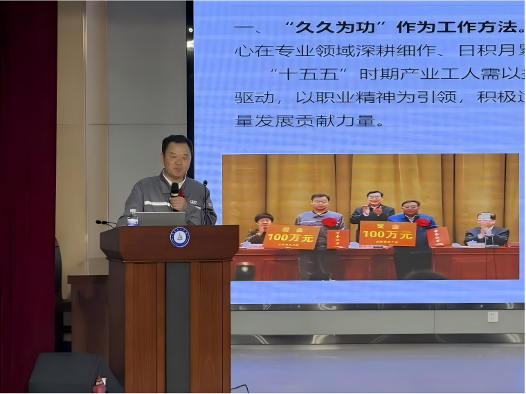 宣讲中,管益辉作为大国工匠结合自身成长经历与岗位创新实践,用朴实语言分享技能报国、匠心筑梦的奋斗故事,深情解读工匠精神的深刻内涵。他勉励同学们:“起点不决定高度,一定要树立终身学习的理念,保持终身学习的态度。”“干一行就要爱一行、精一行,把一件事做到极致,岁月就会献给你打磨后的惊喜。”“用技能报效国家、用匠心铸造精品,一辈子能干好这一件事,就值了!”他以自身的经历告诉大家,步入职场后不再论出身,只看能力与担当;叮嘱同学们珍惜校园时光,搞好同窗情谊,恪守校规校纪,夯实知识根基,锤炼过硬技能,努力成长为知识型、技能型、创新型人才。