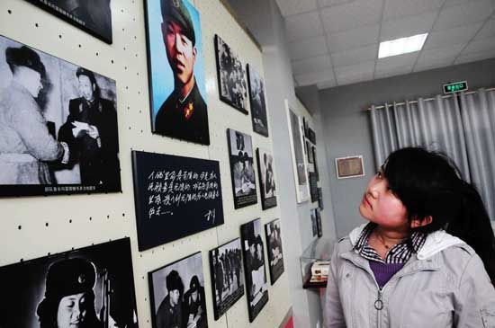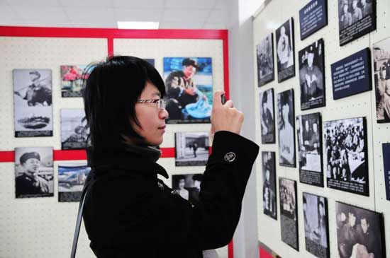 参观者在青岛黄海学院雷锋纪念馆拍照