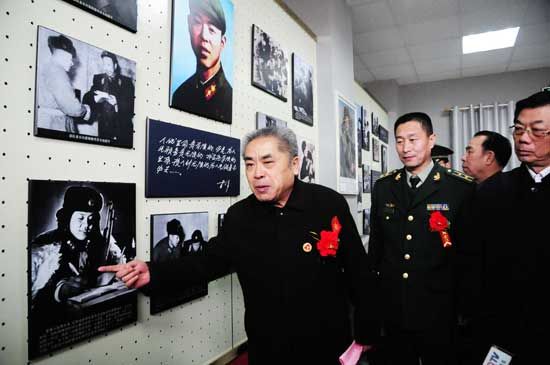 雷锋班第四任班长曲建文(左一)在青岛黄海学院向与会领导嘉宾讲解雷锋事迹