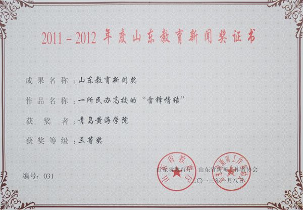 1月8日,由山东省教育厅、山东省新闻工作者协会主办评选的2011—2012年度“山东教育新闻奖”评选结果揭晓,我校宣传部报送的《一所民办高校的“雷锋情结”》荣获集体组织奖三等奖。此文于2012年3月14日《大众日报》刊发。