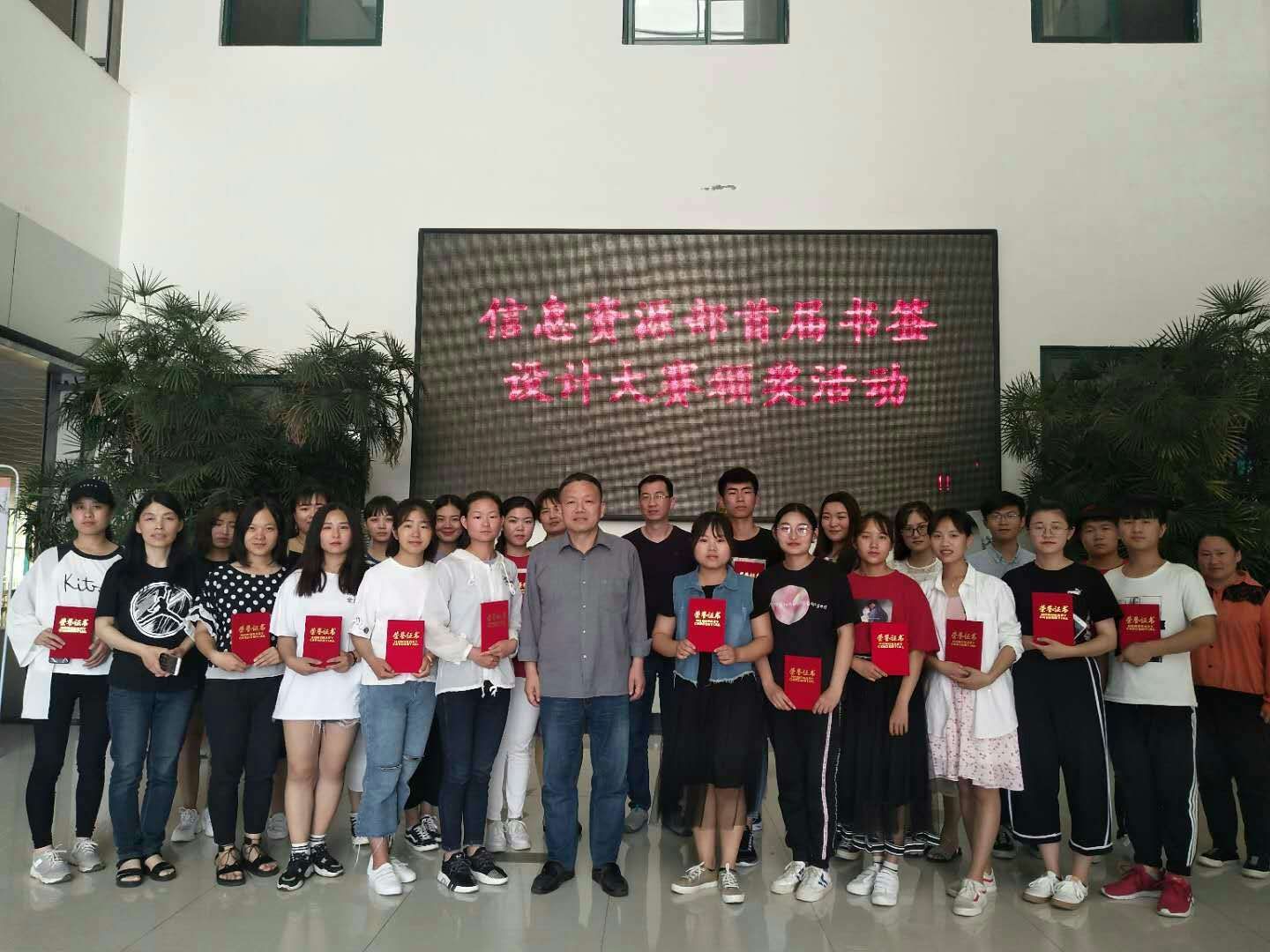 吕老师代表信息资源部向大家发出诚挚的邀请,邀请大家经常来学习,来阅读,充分利用我校的图书资源。最后所有获奖同学和领导老师们在一楼大厅合影留念。本次书签设计大赛是信息资源部读书月系列活动之一,激发了学生的读书热情,让学生自觉养成爱护书、勤读书、读好书的好习惯。
